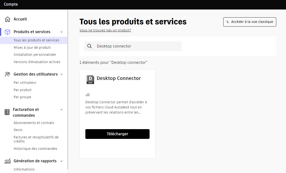 Pour télécharger la version la plus récente, accédez à la page Produits et services de votre compte Autodesk. Desktop Connector s’affiche sous Produits et services.