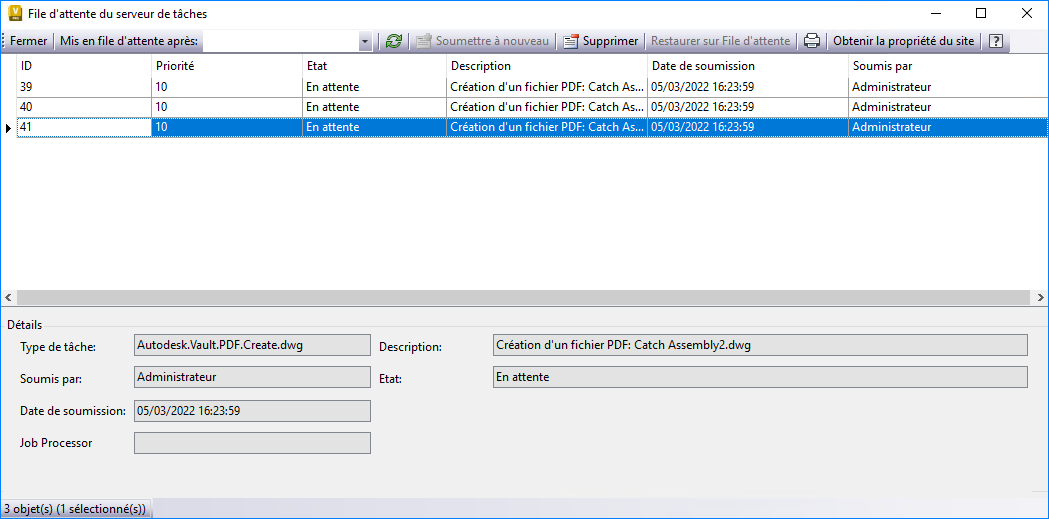 La file d’attente du serveur de tâches est une liste, ou file d’attente, des tâches envoyées par les clients (Inventor, Auto, Vault et Autoloader) et qui sont en attente de traitement. La file d’attente est stockée et gérée par le serveur Vault.