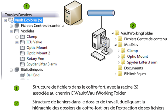 Il n’est pas obligatoire de spécifier un dossier de travail pour commencer à utiliser le coffre-fort, car un coffre-fort est défini par défaut dans Mes documents\Vault. Toutefois, vous pouvez changer l'emplacement du dossier de travail à l'aide de la commande Définir le dossier de travail. Les administrateurs peuvent également appliquer de force un emplacement standard pour le dossier de travail de tous les utilisateurs.