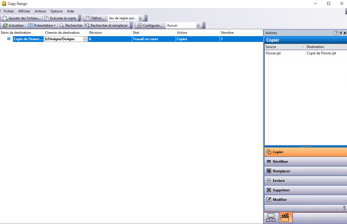 La fonction Copy Design crée une copie de la conception dans la même structure que les fichiers source. Dans la boîte de dialogue Copy Design, vous pouvez choisir les pièces d’une conception existante à copier, réutiliser, remplacer, exclure, supprimer, détacher ou dont la ramification doit être réutilisée.