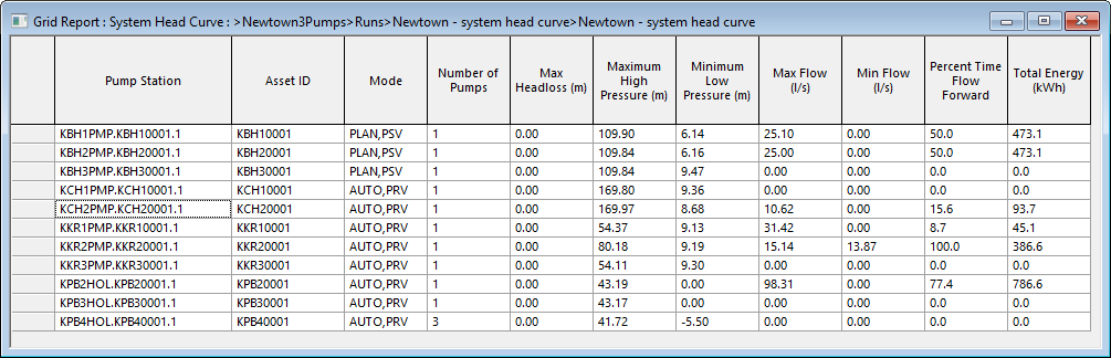 Le rapport Courbe de tête de système fournit des informations de base sur les pompes pour lesquelles les courbes de tête de système sont générées. Le menu contextuel vous permet d’afficher la boîte de dialogue Station de pompage, de visualiser les courbes de tête de système et de localiser les pompes dans le GeoPlan.