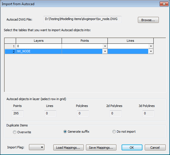 Charge les correspondances de points et de lignes précédemment enregistrées depuis un fichier de configuration AutoCAD dans le tableau des couches. |