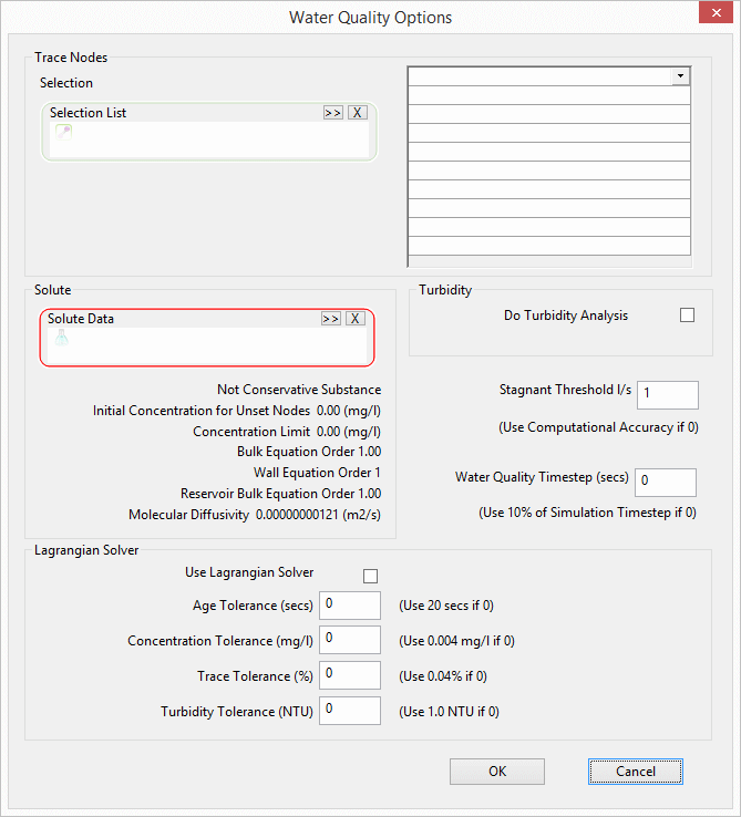 Si cette option est cochée, une approche lagrangienne basée sur le temps est utilisée afin de suivre le mouvement et le mélange de l’eau dans le réseau.