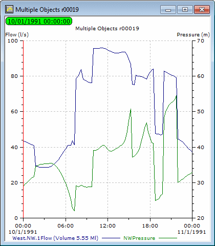 (Représentation graphique des objets sélectionnés) (voir la rubrique Représentation graphique des objets sélectionnés), la ligne de temps rouge indique l’heure actuelle de la simulation qui correspondant à l’heure actuelle de la simulation sur le GeoPlan. Pour passer à une heure de simulation différente, vous pouvez faire glisser la ligne rouge sur l’heure de simulation souhaitée directement sur le graphique. La date et l’heure de la simulation seront mises à jour en conséquence dans le Geoplan.