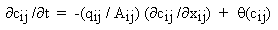 où : cij = concentration de substance dans le lien i,j en fonction de la distance et du temps (par exemple, cij = cij(xij,t)), masse/m3 xij = distance le long du lien i,j, m qij = débit dans le lien i,j au temps t, m3/s Aij = aire de la section transversale du lien i,j, m2 θ(cij) = vitesse de réaction du constituant dans le lien i,j, masse/m3/jour |