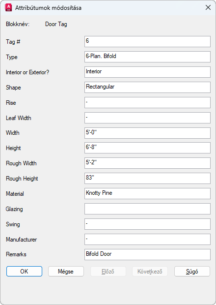 A kijelölt blokk nevét jelzi. Minden attribútum, amelyet a blokk tartalmaz, megjelenítésre kerül ezen a párbeszédpanelen.