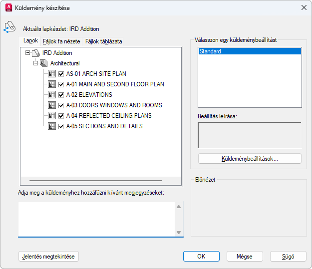 Jelentésinformációt jelenít meg, amely belekerül a küldeménycsomagba. Magában foglal minden beírt küldemény-megjegyzést, és tartalmazza azokat a program által automatikusan létrehozott disztribúciós megjegyzéseket, amelyek részletezik, hogy milyen lépések szükségesek a küldeménycsomag tökéletes működéséhez. Ha például SHX betűtípusok találhatók egy küldött rajzban, megjelenik egy útmutató arról, hova kell másolnia ezeket a fájlokat ahhoz, hogy azok a küldeményt telepítő számítógépen észlelhetők legyenek. Ha készült alapértelmezett megjegyzéseket tartalmazó szövegfájl, akkor a jelentés ezeket is tartalmazza.