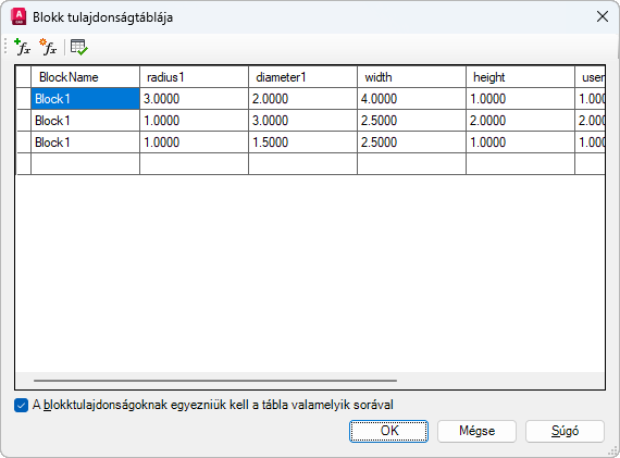 Megjelenik a Paramétertulajdonságok hozzáadása párbeszédpanel, ahol a blokk tulajdonságtáblájában már definiált paraméterek vehetők fel.