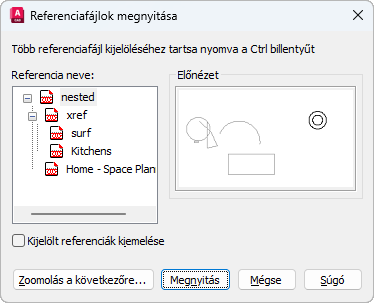 A Referenciafájlok megnyitása párbeszédpanel egy referenciafában az összes egymásba ágyazott xrefet megjeleníti. A kijelölt xref forrásfájlja egy külön rajzablakban nyílik meg, ahol szerkeszthető, menthető, majd bezárható a rajz.