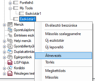 Kattintson a jobb gombbal az Eszköztár1 nevű eszköztárra, ne a leporellóra. Kattintson az Átnevezés gombra, és adjon meg egy új nevet.