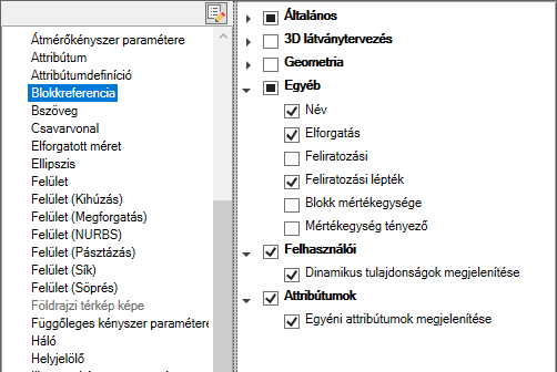 Blokkreferenciák felhasználói tulajdonságai és attribútumai megjelenítésének vezérlése