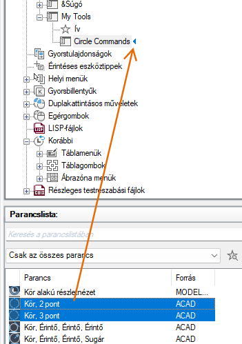 7. A Parancslista területről húzza az almenühöz hozzáadni kívánt parancsot a <fájlnév> testreszabási beállításai ablaktáblára.
