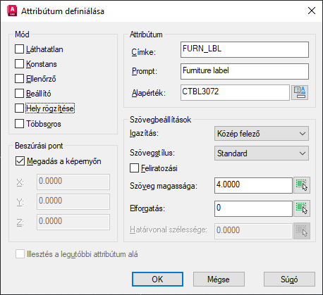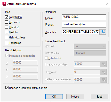 Az Attribútum szakaszban található tulajdonságok határozzák meg a rajzban megjelenő szöveget és az attribútumhoz hozzárendelt értéket.