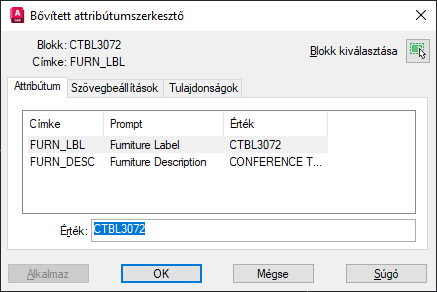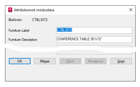 Egy attribútumokkal rendelkező blokk beillesztését követően a blokkra való dupla kattintás után módosíthatók a blokk attribútumainak aktuális értékei.