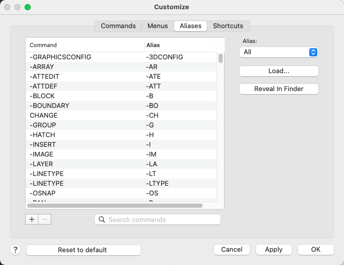 Megjegyzés: Ha le kíván cserélni egy meglévő parancsálnevet (például a C betűt a MÁSOL parancs indításához rendelné a KÖR parancs helyett), akkor érdemes nem módosítani a meglévő parancsálnév-definíciót, és inkább új bejegyzést hozzáadni a Felhasználói parancsálnevek szakaszban. A program a legutóbb megadott definíciót tölti be.