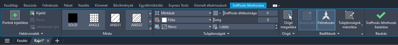 Megjegyzés: A parancs indításakor azonnal megjelenik a Sraffozás létrehozása szalagfül. Ezen a szalagfülön a sraffozás alkalmazásával és szerkesztésével kapcsolatos összes lehetőség megtalálható. Ha a szalag ki van kapcsolva, a SZALAG paranccsal kapcsolhatja be újra.