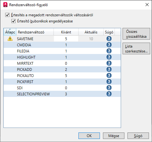 Amikor be van jelölve az Értesítő buborék engedélyezése jelölőnégyzet, megjelenik egy, a Rendszerváltozó-figyelő megnyitására szolgáló hivatkozást tartalmazó értesítő buborék, ahol láthatja, mely rendszerváltozók módosultak.