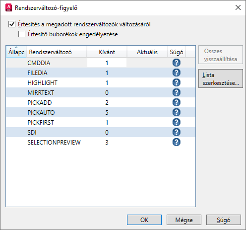 A parancspromptba írja be: RENDSZERVÁLTFIGYELŐ. A Rendszerváltozó-figyelő párbeszédpanelen láthatja a jelenleg megfigyelt rendszerváltozókat.