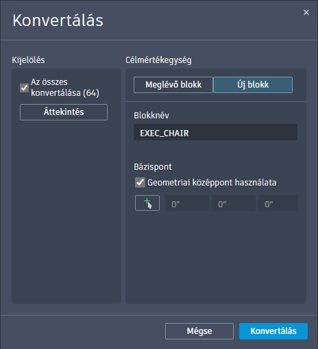 Dönthet úgy is, hogy új blokká konvertálja a forrásobjektumot vagy a kiválasztott példányokat. A Konvertálás párbeszédpanelen határozzon meg egy új blokkot a blokknév és a beillesztési pont megadásával. Alapértelmezés szerint a beillesztési pont a kijelölt geometria középpontjára van beállítva.