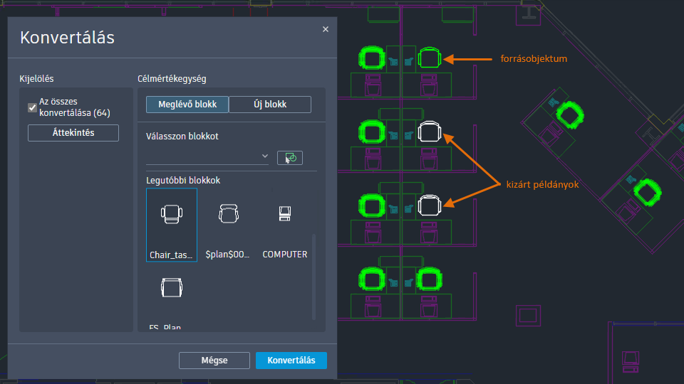 Blokk konvertálása: A BKONVERTÁL parancs mostantól ránagyít a kiválasztott objektumokra. A Konvertálás párbeszédpanel a blokkok fóliákhoz való hozzárendelésének lehetőségét is tartalmazza. Ezenkívül az új BCONVERTINCLUDEEXISTINGBLOCKS rendszerváltozó határozza meg, hogy a meglévő blokkpéldányok kiválasztása alapértelmezés szerint a BKONVERTÁL paranccsal történjen-e.