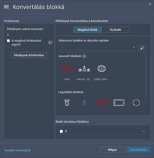 Lehetővé teszi annak kiválasztását, hogy a program a kijelölt példányokat egy már meglévő blokkba konvertálja, vagy létrehozzon egy új blokkot.