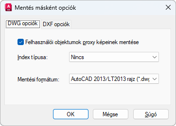 Ha egy korábbi formátumban ment, vagy a rajz másik alkalmazásból származó felhasználói objektumokat tartalmaz, a felhasználói objektumok képeinek a rajzfájlba mentéséhez a Felhasználói objektumok proxy képeinek mentése lehetőséget válassza. (PROXYGRAPHICS rendszerváltozó)