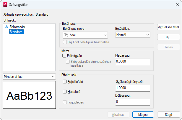 A párbeszédpanelen történő stílusváltoztatást a rajzban az aktuális stílusra és az aktuális stílusú szövegre alkalmazza.