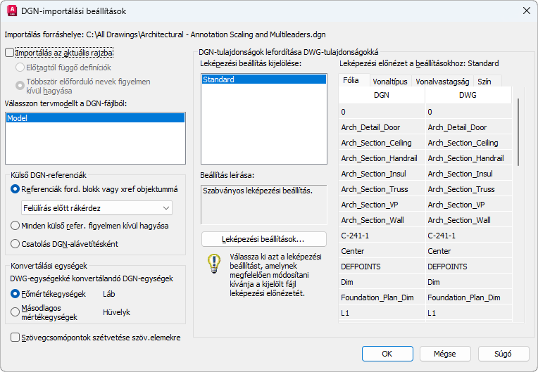 Az alapértelmezett leképezési beállítás a Standard, amely adatokat emel ki az éppen exportált rajzból, és a leképezési előnézetben látható módon automatikusan leképezi a DGN-fóliákat, a -vonalvastagságokat és a -színeket.