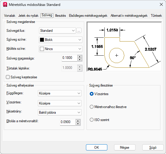 Ha a lapon megadott szövegstílus rögzített szövegmagassággal rendelkezik, akkor a magasság felülbírálja az itt beállított magasságot. Ha itt szeretné beállítani a méretszöveg magasságát, akkor a szövegstílusban megadott magasság értékét állítsa 0-ra. A szövegstílusok magasságának beállítására vonatkozó további részleteket lásd a STÍLUS parancsnál.
