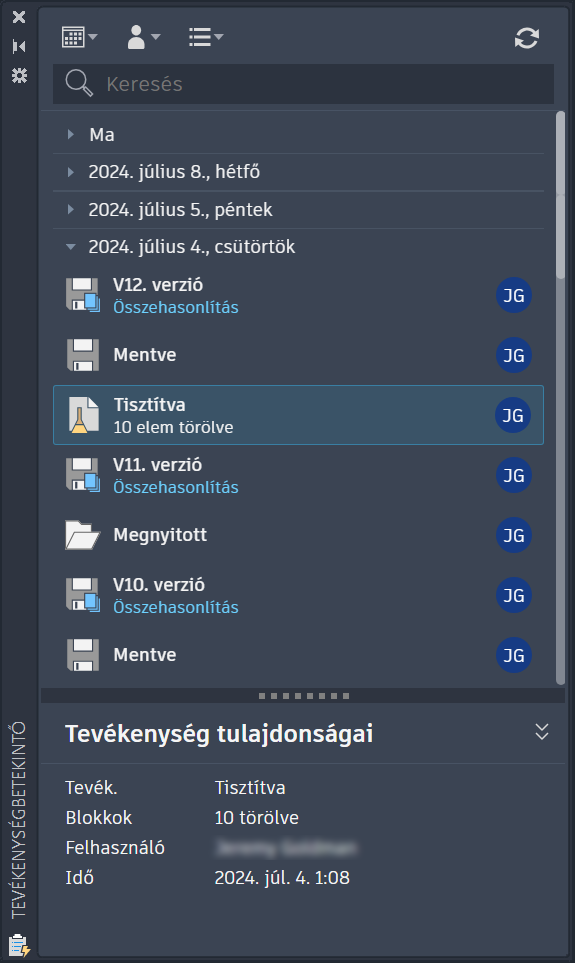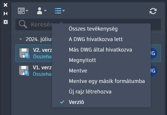 Megjegyzés: Az AutoCAD LT jelenleg csak a verziótevékenységeket jeleníti meg a Tevékenységbetekintő palettán.