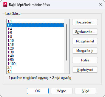 Az aktuálisan definiált léptékek listáját jeleníti meg. Az xrefek csatolásakor importált ideiglenes léptékek is megjelennek. Ha egy léptéknév megismétlődik, de értéke más, a név kiegészül egy számmal.