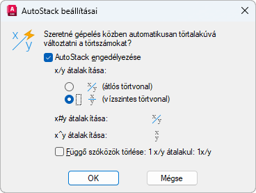 A perjelet (/) vízszintes törtvonallá konvertálja, ha az AutoStack lehetőség be van kapcsolva.