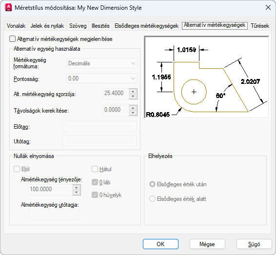 Meghatározza az alternatív mértékegységek megjelenítését a méretekben, és beállítja a formátumukat és pontosságukat.