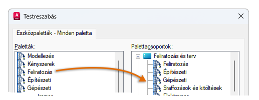 Az eszközpaletták segítségével a blokkokat, sraffozásokat és egyéni eszközöket egy lapokat tartalmazó ablakban rendszerezheti. Eszközpalettákat többféleképpen is létrehozhat.
