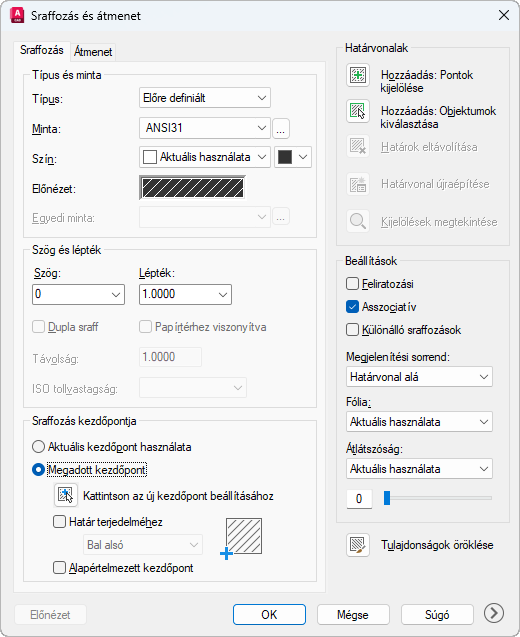 A Sraffozás és átmenet párbeszédpanelen két lapot és néhány közös beállítást tartalmaz, amelyek mindkét lapról elérhetőek.