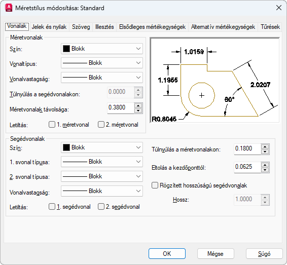 Beállítja a méretvonalak, méret-segédvonalak, nyílfejek és középpontjelek formátumát és a tulajdonságait.