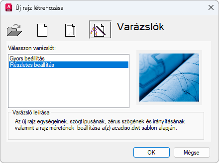 Megjelenik a Részletes beállítás varázsló, amelyen az új rajz mértékegysége, szöge, zérusszöge, szögmérési iránya, valamint rajzterülete állítható be. A Részletes beállítás varázsló a beállításokat, például a szövegmagasságot és a raszter eltolását is a léptékhez igazítja.