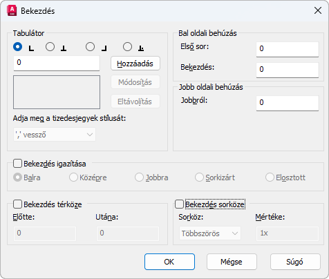 Tabulátorbeállító opciókat jelenít meg, beleértve a tabulátorok hozzáadását és eltávolítását is. Az opciók többek között a következőket tartalmazzák: balra, középre, jobbra, tizedes igazítás. Tabulátorok a Helyi szövegszerkesztő vonalzóján a Tabulátorkiválasztó gomb segítségével is beállíthatók.