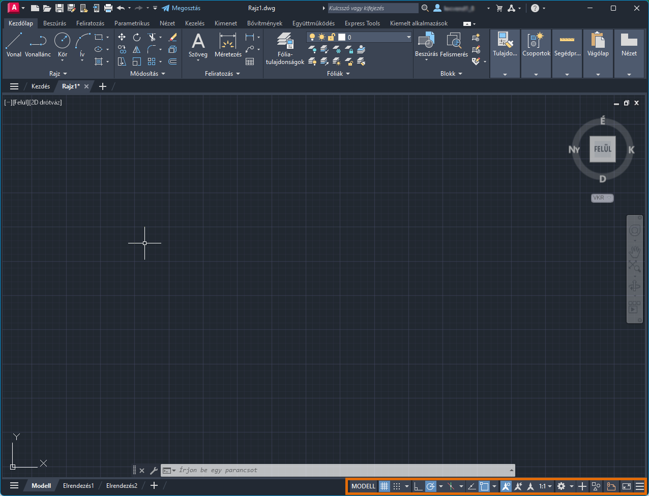 Az állapotsor gyors hozzáférést biztosít a leggyakrabban használt rajzeszközökhöz. Válthat az olyan beállítások között, mint a háló, raszter, poláris követés és tárgyraszter. Az eszközök némelyike esetében további beállítások is elérhetők, ha a legördülő nyílra kattint.