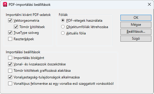 Megadja egy adott PDF-fájlból származó geometria, kitöltések, raszterképek és TrueType szövegobjektumok importálási beállításait.