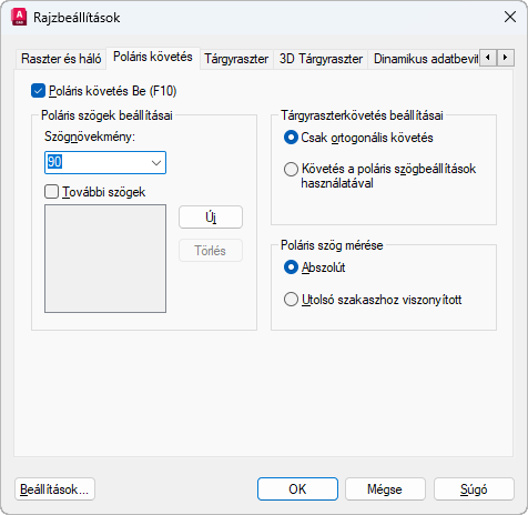 Ha a További szögek jelölőnégyzet ki van választva, akkor itt a program felsorolja a további elérhető szögeket. Új szögek hozzáadásához kattintson az Új gombra. Meglévő szögek eltávolításához kattintson a Törlés gombra. (POLARADDANG rendszerváltozó)