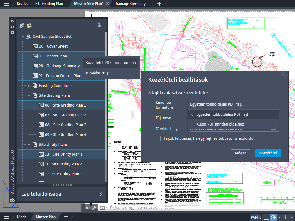 A változások közé tartozik például, hogy több lapot is ki lehet választani a közzétételhez, ki lehet választani, hogyan szeretné közzétenni vagy továbbítani a kiválasztott lapokat, nagyobb kontrollt kap a PDF-fájl (vagy e-Küldemény) neve és helye fölött, és arra is lehetősége nyílik, hogy felülírja a meglévő fájlokat a közzététel vagy az e-Küldemények továbbítása során.