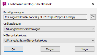 Az Autodesk Civil 3D az alapértelmezett csőhálózati alkatrészkatalógust a C:\Documents and Settings\All Users\Application Data\Autodesk\Civil 3D <verzió>\hun\Pipes Catalog mappába telepíti. Más katalógust is használhat rajzában, ehhez kattintson az Alap lap