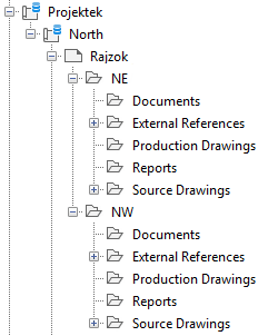 A 2. ábra szerint az NE és NW projektek a North nevű Vault projekten belül találhatók. A Vault referenciák bármely objektumra mutathatnak a North projektmappán belül. Ha ki kívánja terjeszteni ezeket a referenciákat más projektekre, hozzon létre új mappákat ezekhez a projektekhez a North projekt munkamappáján belül. Hozza létre a projektstruktúra másolatát a Vault tárban az Autodesk Vault rendszer-felügyeleti eszköz segítségével. Almappákat a rajzok és dokumentumok mappáinak rendezéséhez használhat egy projektben, de más projektobjektumok, például a Kereső hivatkozásainak vagy a Vault adatbázis fájljainak (PointsStatus.mdb, PointsGeometry.mdb, Survey.sqlite és Survey.sdxx) rendezéséhez nem.