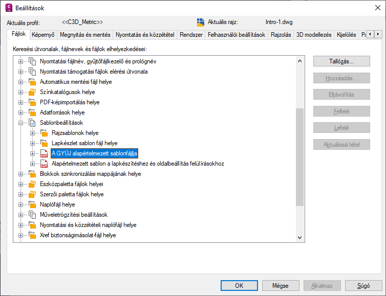 Amikor az angolszász profillal indítja el az Autodesk Civil 3D programot, az új rajzok alapértelmezett sablonja az _Autodesk Civil 3D (Imperial) NCS.dwt fájl. Amikor a metrikus profillal indítja el az Autodesk Civil 3D programot, az új rajzok alapértelmezett sablonja az _Autodesk Civil 3D (Metric) NCS.dwt fájl. Ha elindítja az Autodesk Civil 3D programot, vagy létrehoz egy új rajzot (GYÚJ parancs), az alapértelmezett sablon kerül alkalmazásra. Megadhat egy olyan másik alapértelmezett sablont, amely jobban megfelel az igényeinek.