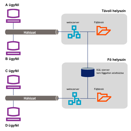 A 6. ábrán látható, hogy egy többhelyes Vault telepítéséhez egyetlen SQL szerver szükséges, és ez kezeli mindegyik hely fájljait. Mindegyik adatbázis (más néven „Vault tár”) általában minden helyszínen többszörözve van a fájlmegosztás megkönnyítése érdekében, de nem minden fájl van másolva. Az egyéni fájlok szükségük szerint vannak elosztva a felhasználók között. Az SQL Server nyomon követi a fájlok másolatainak helyét és biztosítja ezek frissítését, illetve hogy a felhasználók értesítve legyenek a módosításokról. A teljes hálózat adatbázis-felügyeleti feladatai bárhonnan elvégezhetők.