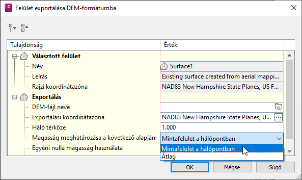 A 4. ábrán látható Felület exportálása DEM-formátumba párbeszédpanelen állíthatja be az exportált DEM-fájl háló térközét. Az 1 értékű hálótérközhöz képest a 2 értékű hálótérközhöz a pontok negyede szükséges az adott terület lefedéséhez. Magasabb számértéket használjon az olyan DEM-fájlok létrehozásához, amelyek kisebb méretűek és kevésbé részletesek.