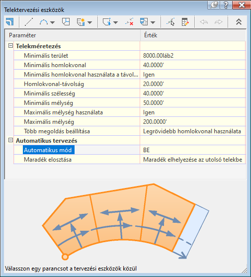 A Telektervezési eszközökkel automatikusan vagy félig automatikusan is feloszthatja a meglévő telkeket. Az Automatikus módban a Telektervezési eszközökkel automatikusan elrendezheti az elérhető területeket elfoglaló több új telket, illetve megtekintheti előnézetüket. Ha kikapcsolja az Automatikus módot, a tervezési eszközök egyszerre csak egy új telket rendeznek el.
