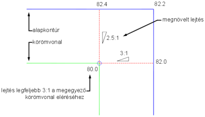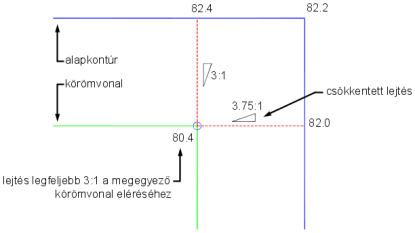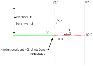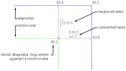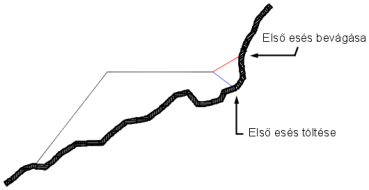 Első bevágása: Az alapkontúrtól felfelé lejtéssel próbál meg a program rézsűt létrehozni. Ha nem talál megoldást, lefelé fog lejteni.