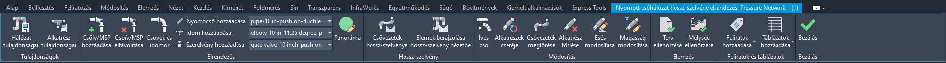 Panoráma: Megnyitja a nyomócsőhálózat Panoráma nézetét, amelyet nyomócsőhálózat tulajdonságok megjelenítéséhez és szerkesztéséhez használhat.